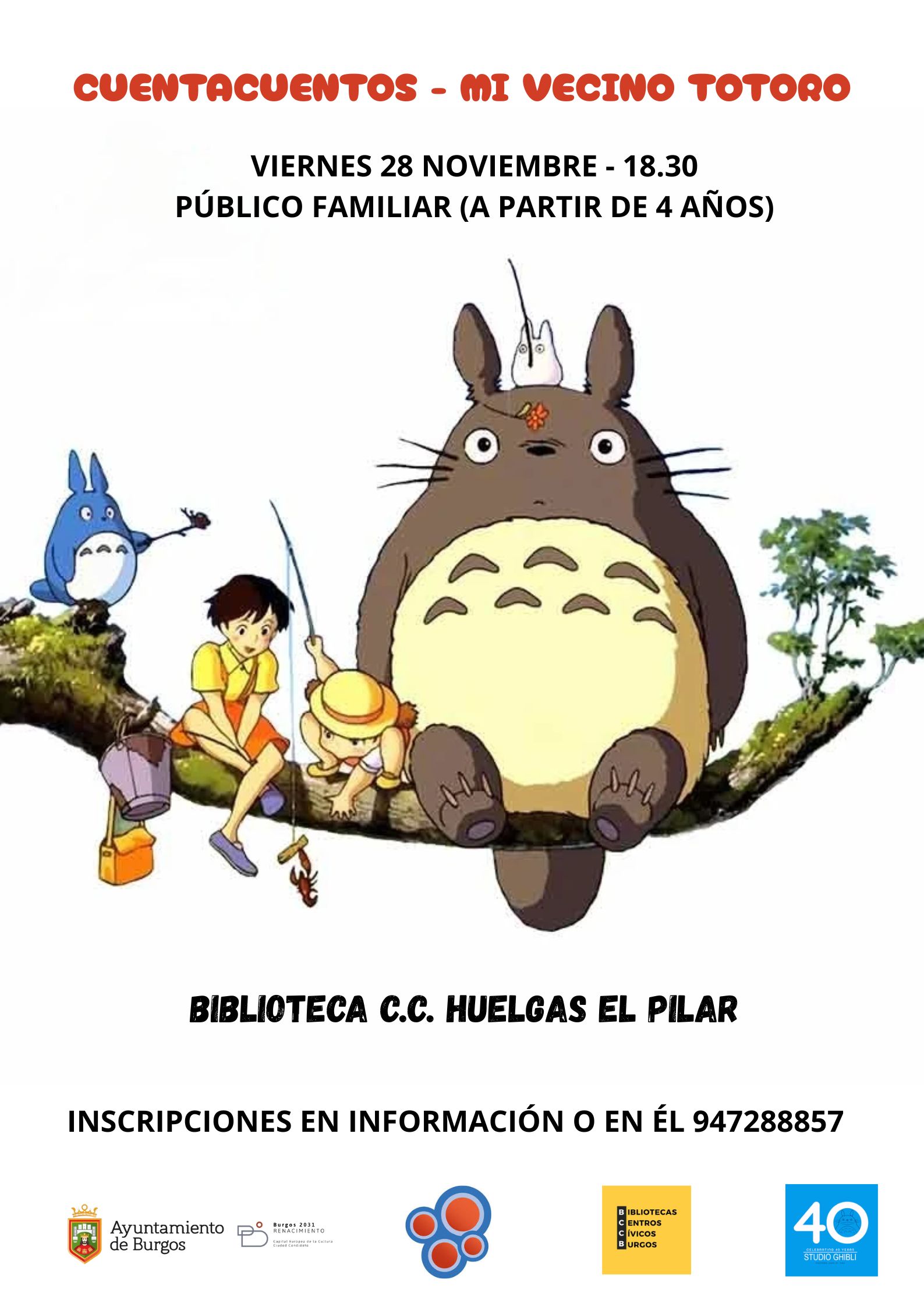 Con motivo de los 40 años de la creación de los Studio Ghibli, la Biblioteca del Centro Cívico las Huelgas-El Pilar os invitamos a conocer a uno de sus personajes más entrañables, Totoro.