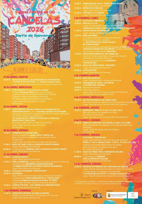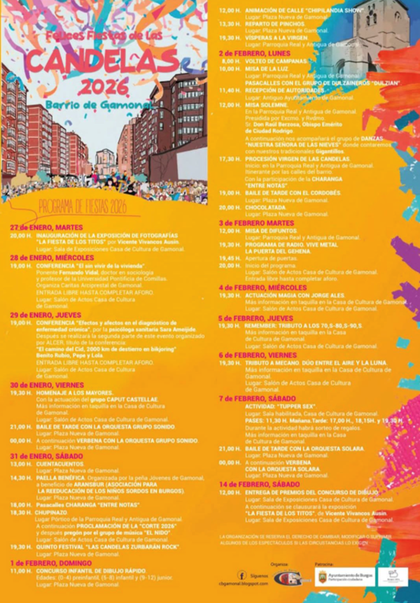 Fiestas en honor a la Virgen de Las Candelas (2 de febrero) con numerosas actividades y un mercado medieval. Organiza Consejo de Barrio de Gamonal.