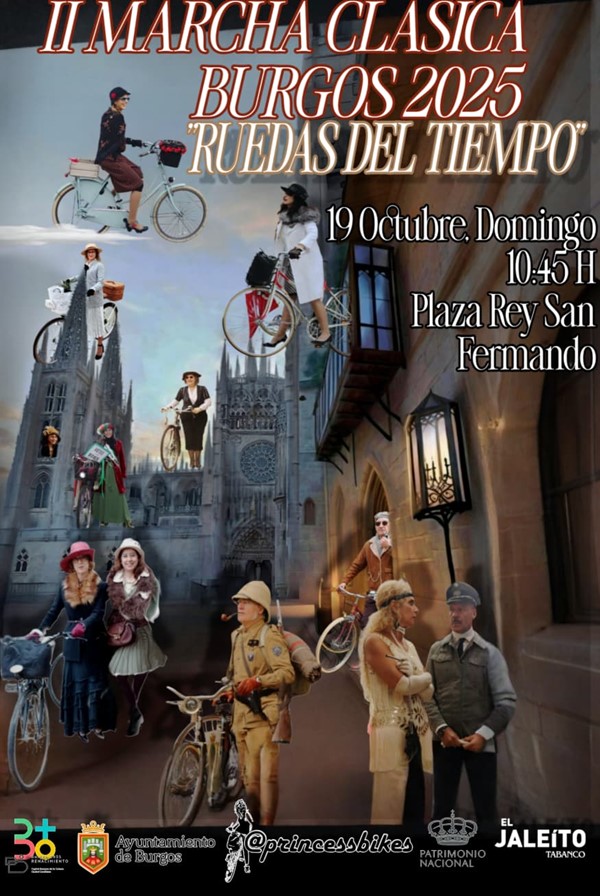 Ven vestido con tu ropa del siglo pasado y decora tu bicicleta.10:45 Concentración en la Catedral.11:00 Salida en bici11:50 Visita del Monasterio de las Huelgas12:00 Vermut en Huelgas Bulevar13:00 Aperitivo en Jaleíto15:00 Comida en el Casino