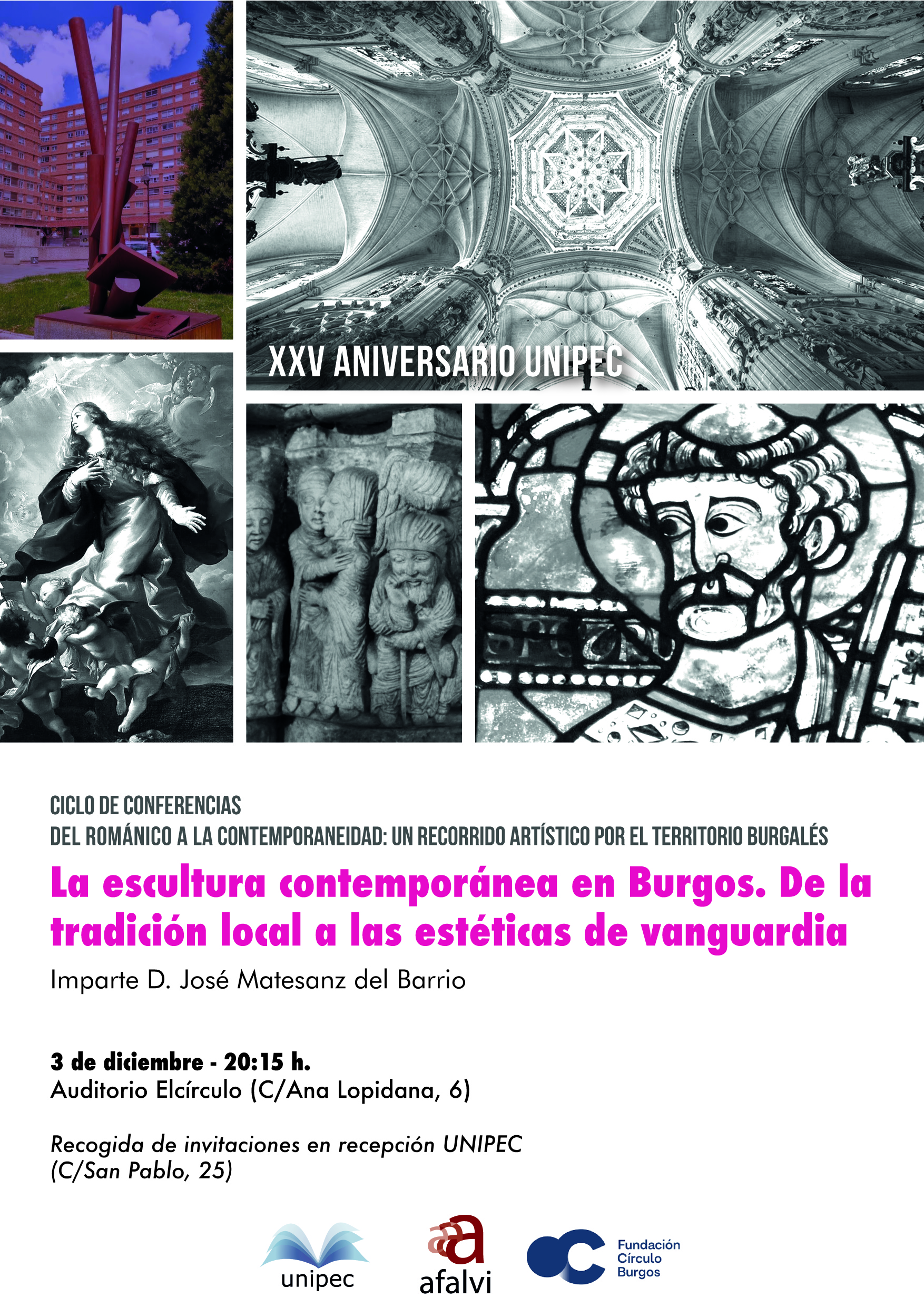 Quinta y última conferencia del ciclo "Del Románico a la Contemporaneidad: un recorrido artístico por el territorio burgalés". D. José Matesanz del Barrio impartirá la conferencia del clausura del ciclo en el Auditorio "Elcírculo" en la calle Ana Lopidana, 6.