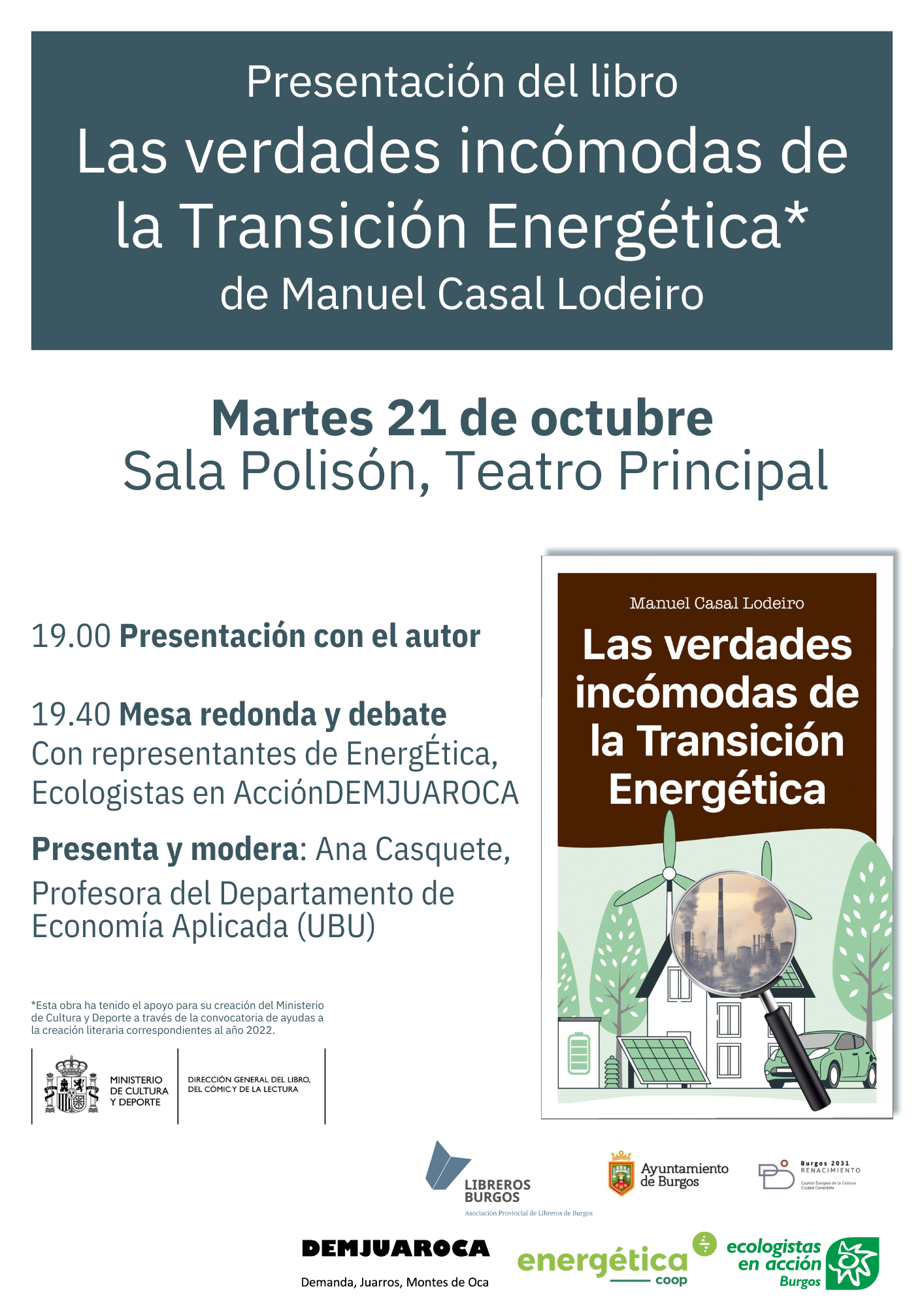 No te pierdas esta oportunidad para escuchar y dialogar con Manuel Casal Lodeiro, una de las voces ibéricas insoslayables en materia energética y ecosocial. Presentará su libro "Las verdades incómodas de la transición energética" y participará en un diálogo con el público y con los colectivos EnergÉtica, DEMJUAROCA y Ecologistas en Acción, que trabajan la misma temática a nivel local, provincial y regional...¡te esperamos!