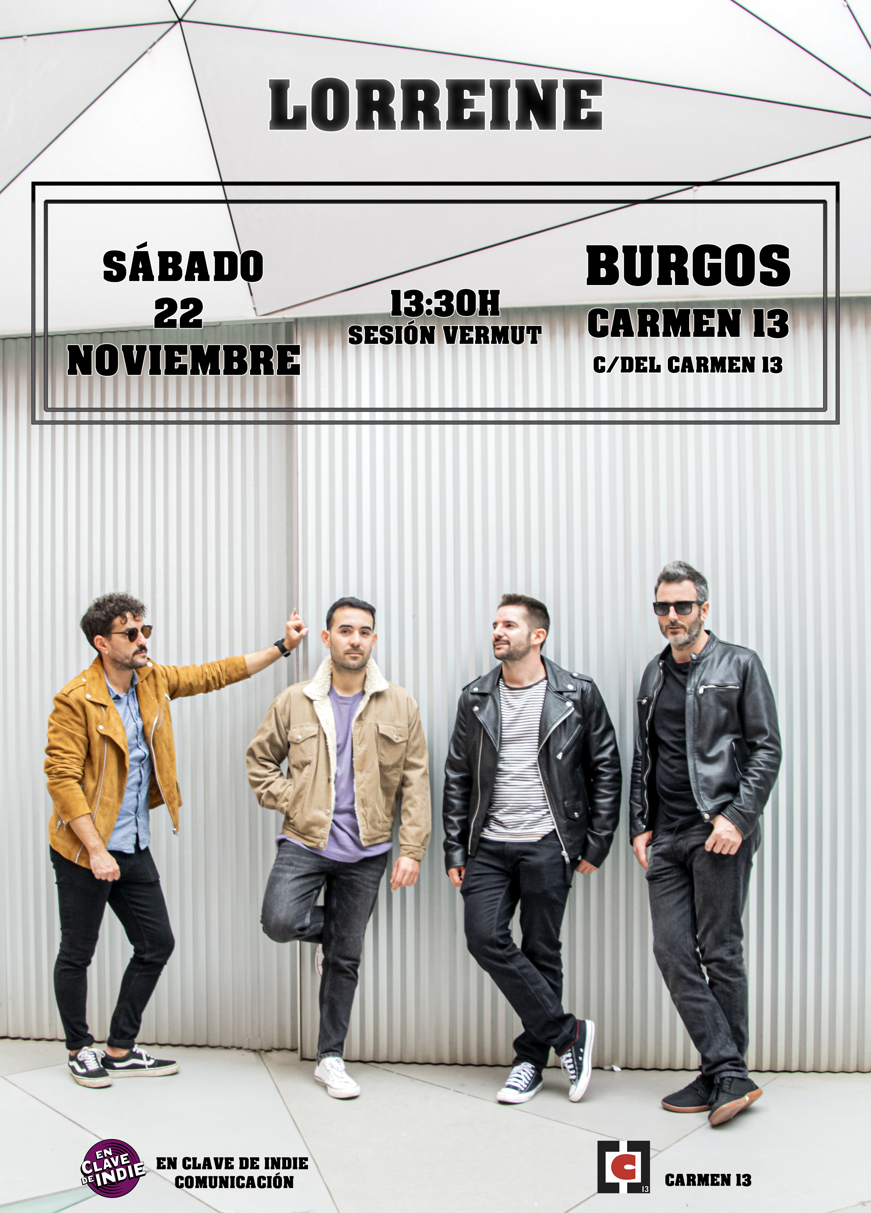 Ven a disfrutar de la banda de indie pop-rock Lorreine el próximo sábado 22 de noviembre en sesión vermú en la sala Carmen 13 (Burgos). Una ocasión ideal para conocer las canciones de su último trabajo, "HATERS" en horario matinal apto para toda la familia. ¡Os esperamos!
