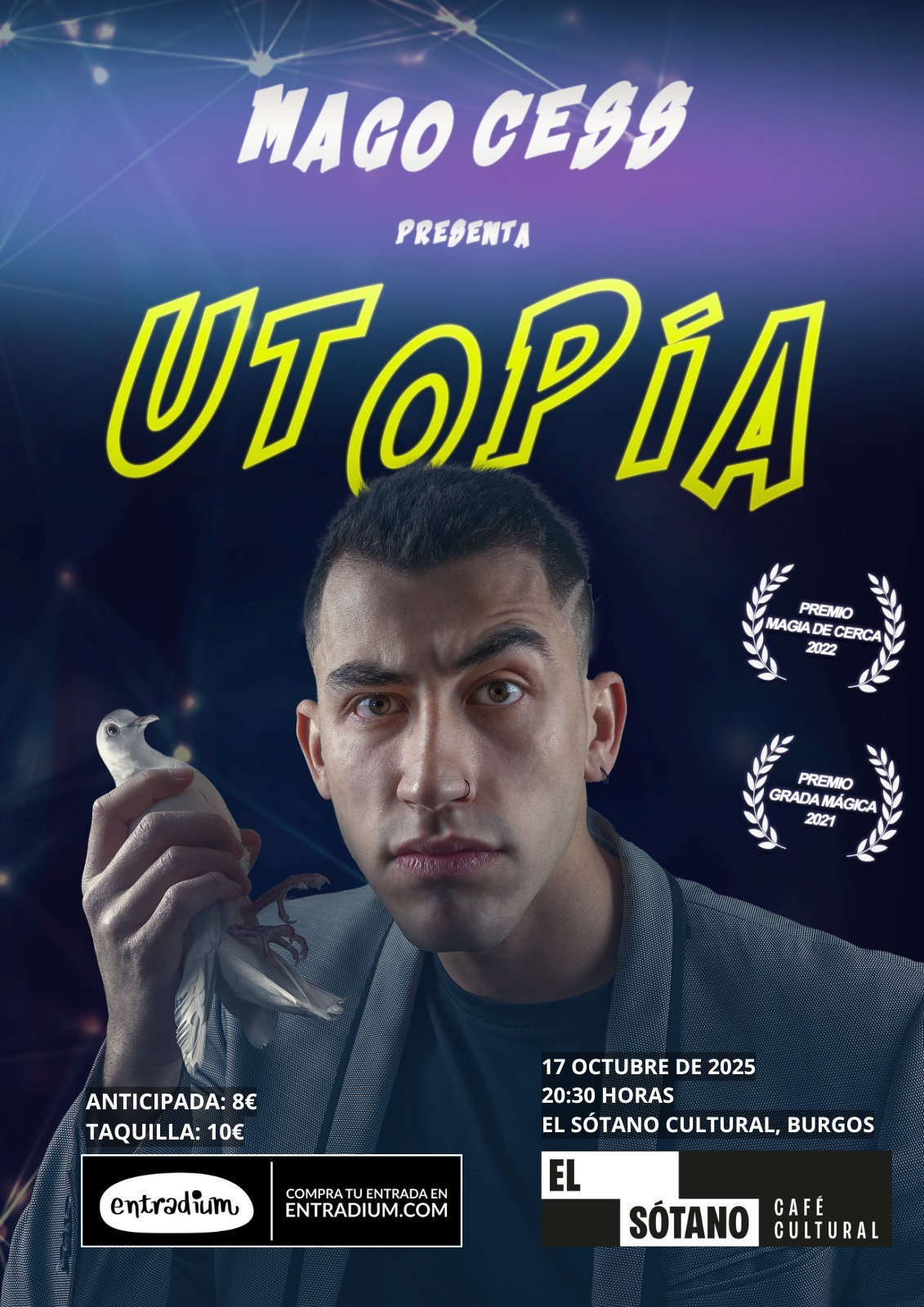 UTOPÍA – El espectáculo de magia de Cess ¡Descubre un show que hará soñar a toda la familia! El joven ilusionista Cess te invita a un mundo donde lo imposible se hace realidad: Teletransportaciones, sorprendentes transformaciones y adivinaciones que desafían la lógica. Ríe, asómbrate y vuelve a sentir la ilusión de la infancia, aunque sea solo por una noche. Un plan perfecto para niños, jóvenes y adultos. No te quedes sin tu entrada y vive la magia de “UTOPÍA”!