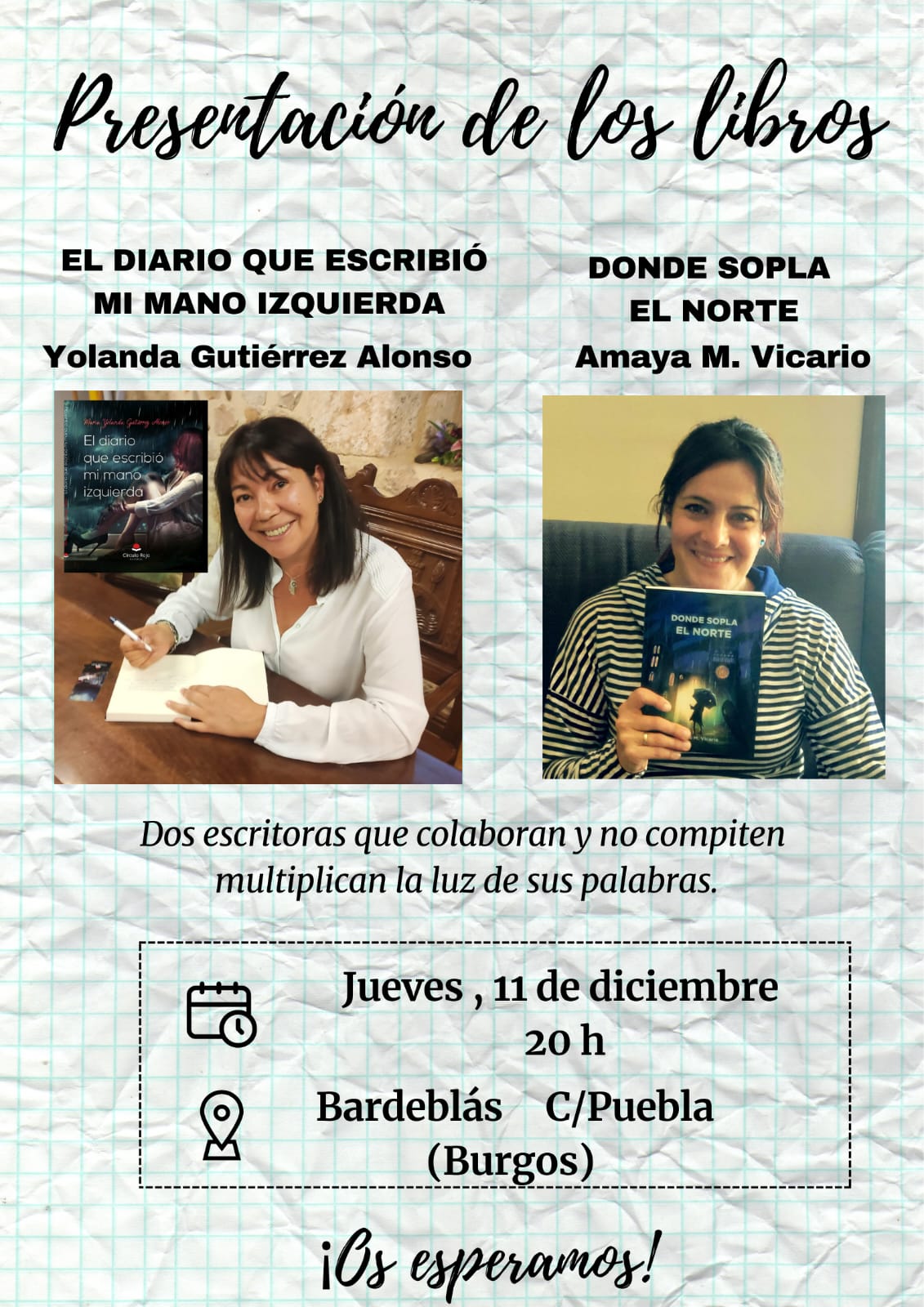 Presentación de los libros: • EL DIARIO QUE ESCRIBIÓ MI MANO IZQUIERDA• DONDE SOPLA EL NORTEDos escritoras que colaboran y no compitenMultiplican la luz de sus palabrasYolanda Gutiérrez Alonso Amaya M. VicarioOs esperamos
