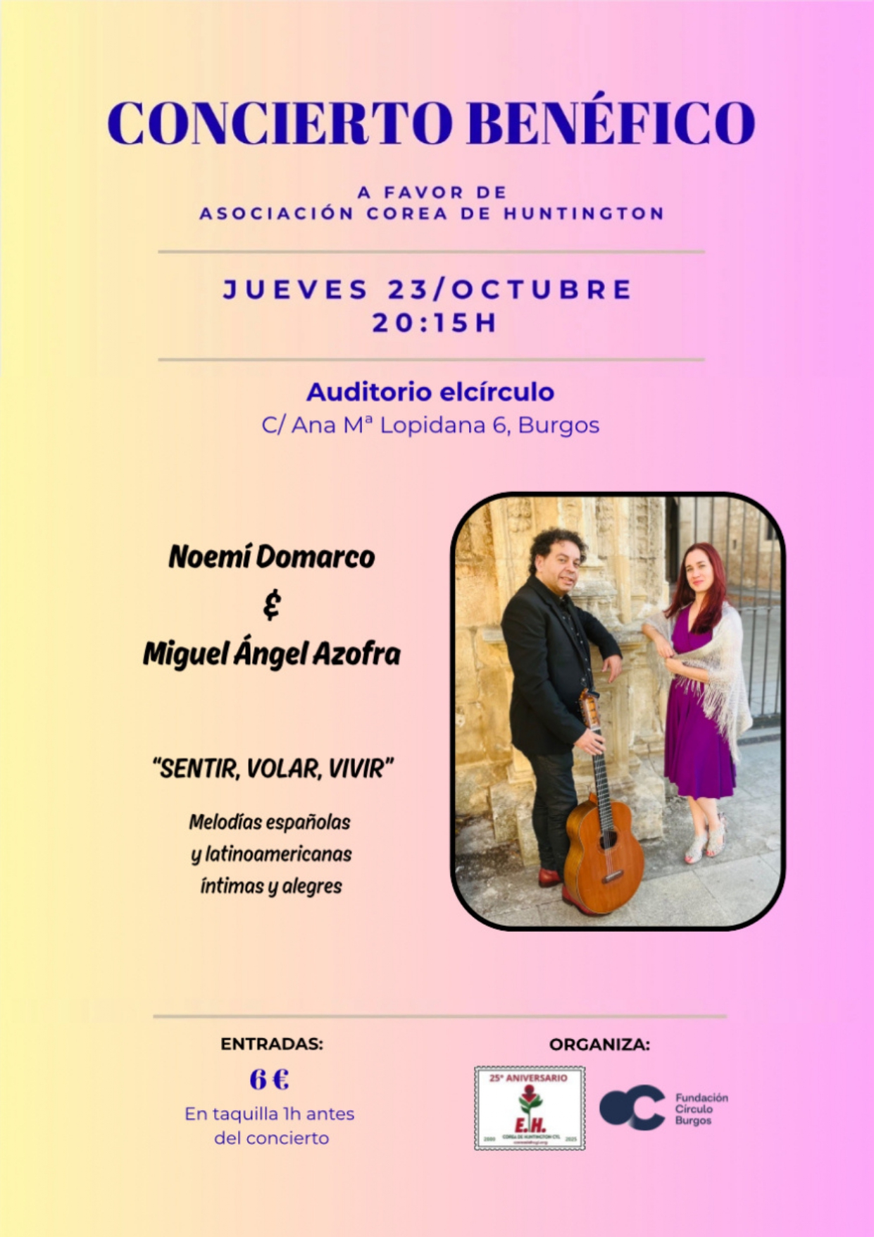 Concierto benéfico a favor de la asociación Corea de Huntington de Castilla y León por su 25 aniversario.Intervienen:Noemí Domarco, cantante, y Miguel Angel Azofra, guitarra.