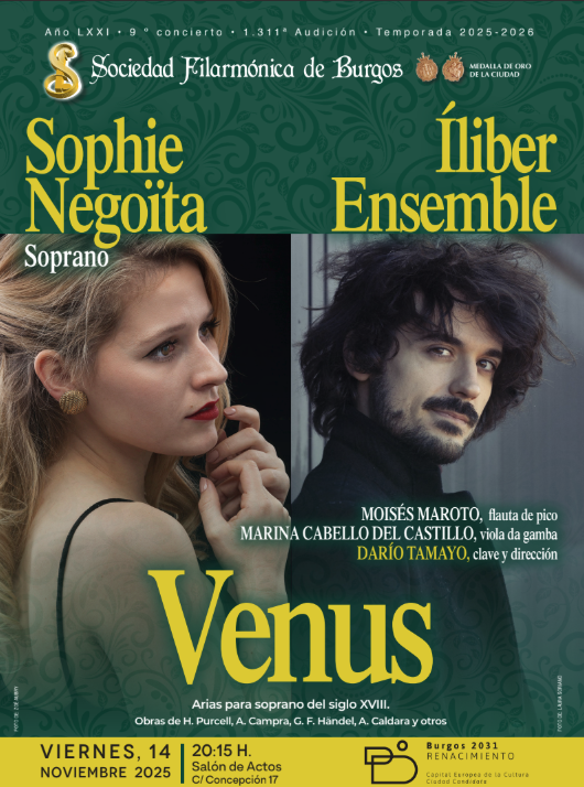 Actuará la soprano SOPHIE NEGOÏTA, con Íliber Ensemble, grupo compuesto por MOISÉS MAROTO, flauta de pico; MARINA CABELLO DEL CASTILLO, viola da gamba; y DARÍO TAMAYO, clave y dirección. Interpretarán el programa VENUS, arias para soprano del siglo XVIII, gobras de H. Purcell, A. Campra, G. F. Händel, A. Caldara y otros.