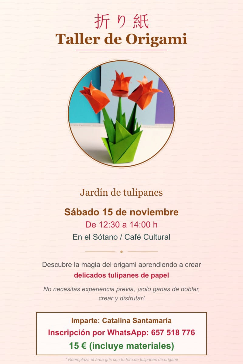 Taller de Origami "Jardín de Tulipanes" Descubre la magia del origami aprendiendo a hacer delicados tulipanes de papel. Sin necesidad de experiencia previa, solo ganas de doblar, crear y disfrutar!! Precio 15 € (Incluye materiales) Imparte: Catalina Santamaría. Inscripciones wasap: 657518776 .